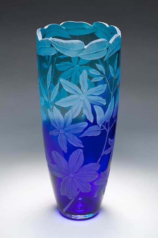 Clematis flowers etched in blue vase