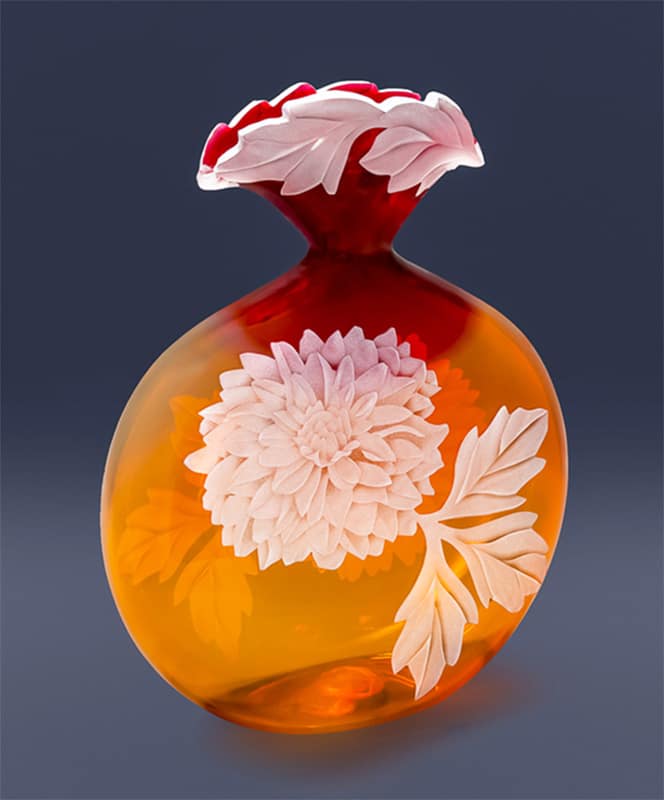 Dahlias etched in Topaz/Ruby glass