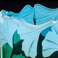 The Great Blue Heron has been my most popular piece since I created it. This piece has the most dramatic cut-away lip of all my work and it often creates an optical illusion making it look like a complete globe. I have drawn and etched a flying Heron through the trees on the back of the vase. The glow of the topaz color highlights the detail of this statuesque bird head and face, and also catches light at the edge of the wing tips.